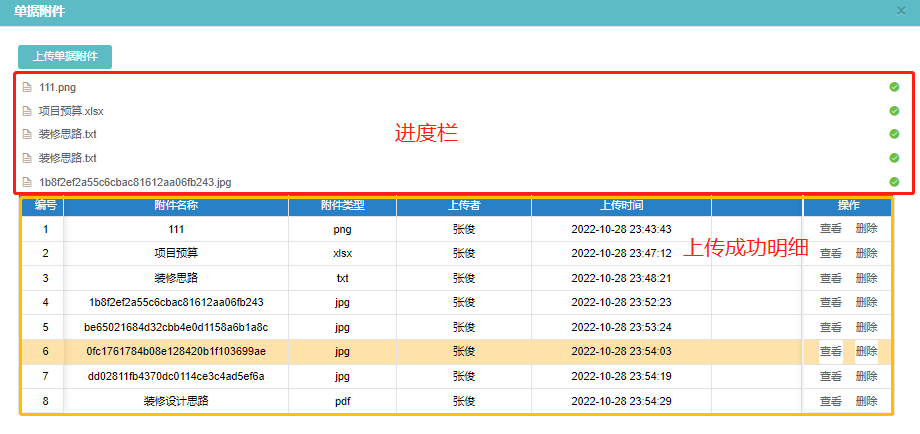 此时使用单据附件功能无报错提示,且可正常上传附件内容,上传成功后会出现明细列表,包含附件名称,附件类型,上传者,上传时间,查看,删除,证明上传成功且可使用,选中具体附件后面对应的查看功能可进行附件查看,删除功能可进行删除;进度栏仅为当次上传时显示,后续查看时自动消失;