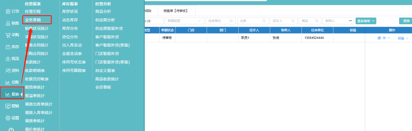 如新增销售单据保存为了草稿,则需到业务草稿中查询需要添加单据附件的草稿单据,通过左侧导航栏“报表”进入业务草稿;