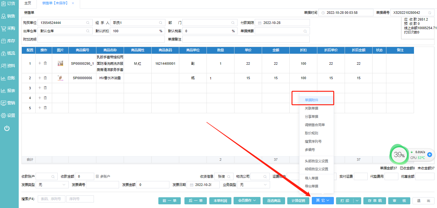 单据附件:指在已有单据基础上上传本地图片、文档、视频等相关内容作为凭证,方便日后单据内容查询核验,此功能为个性化定制功能,非单据必填项,且只能在已发生的销售单(草稿和正式单据)中使用,只要销售单存在,对上传附件时间没有限制,对操作员权限有限制。