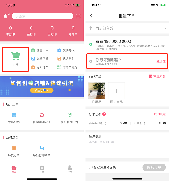 这里所看到的下单二维码,主要功能同邀请下单功能相同,都是用于分享给用户进行填写收件人发货的,另外这里还有一个查件二维码,可用于分享给用户进行物流查询;
