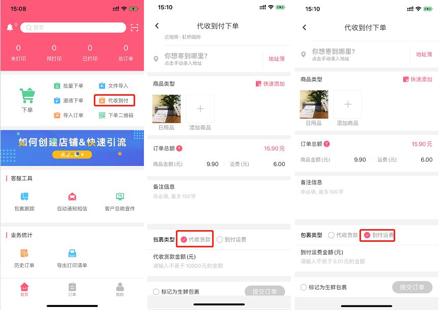 代收到付,主要用于商品货到代收货款和快递到付运费的的应用场景;(注:代收货款已支持申通、中通、韵达、百世、圆通)