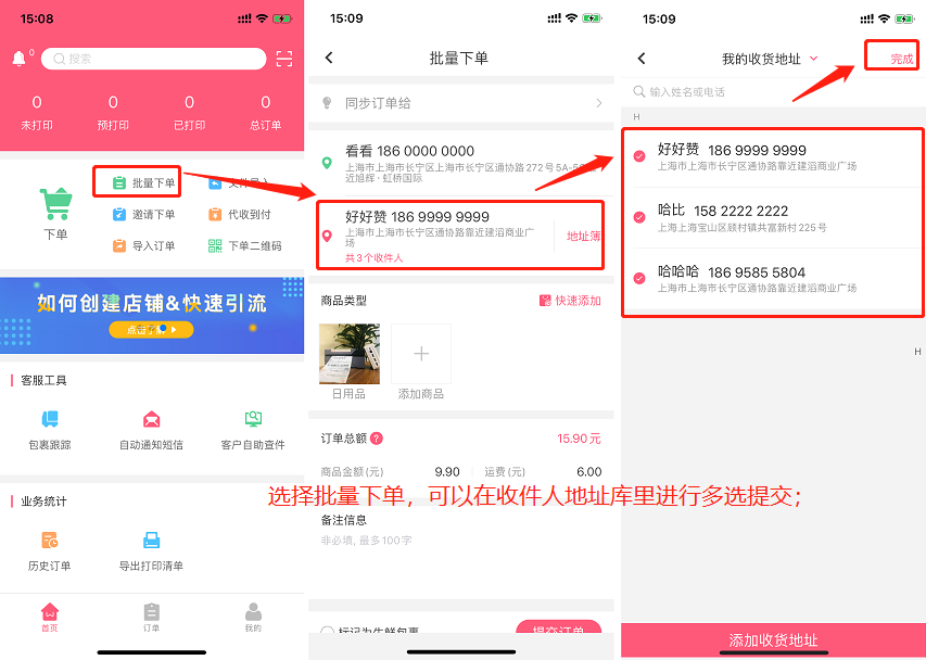 批量下单,可用于单个商品有多个收件人地址进行发货;