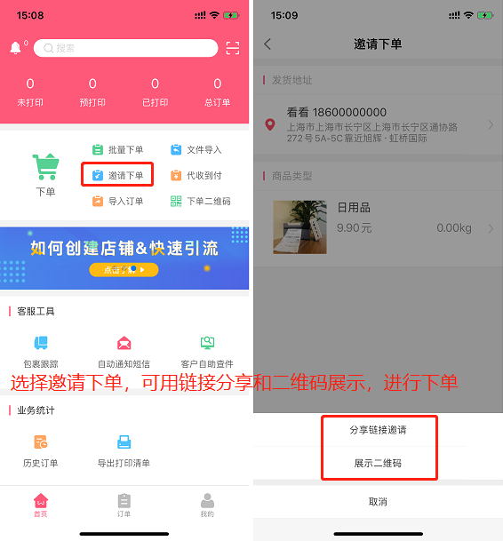 邀请下单,可用于分享给用户自主填写收件人信息;