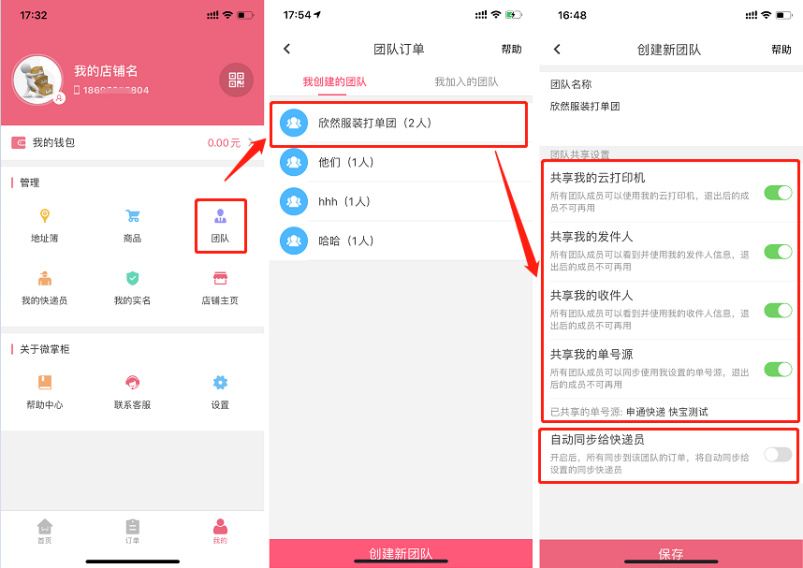 v3.1新版已取消普通团队和企业团队,合并为团队,除了在原有基础同步功能外,新增了发件人、收件人、自动同步订单给快递员功能,可有效提升团队协作能力。