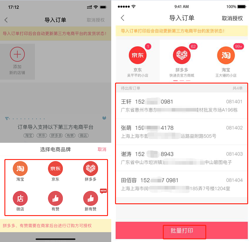 - 同步订单授权导入(如拼多多、淘宝等)