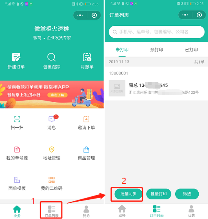 打开微掌柜火速猴小程序——首页订单——批量同步——勾选同步的订单——点击同步——选择所要同步的团队和快递员即可完成;