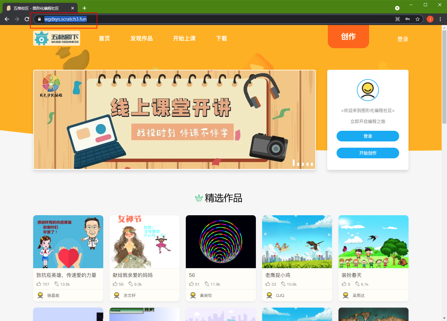 1. 浏览器地址栏输入校区登录网址\*\*\*\*scratch3.fun,进入编程社区