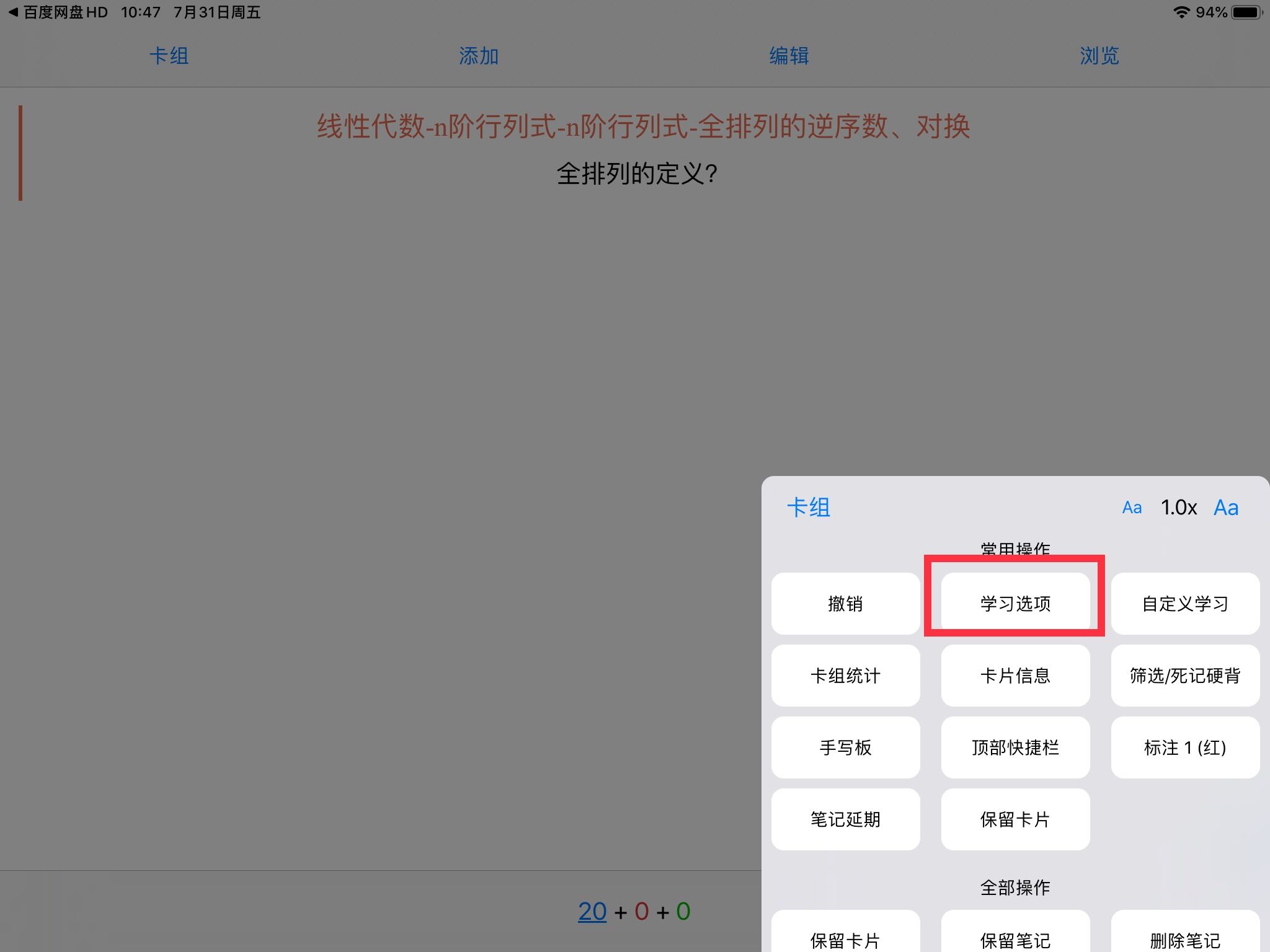 你就会看到:「选项组」、「组管理」、「新卡片」、「复习」等选项。