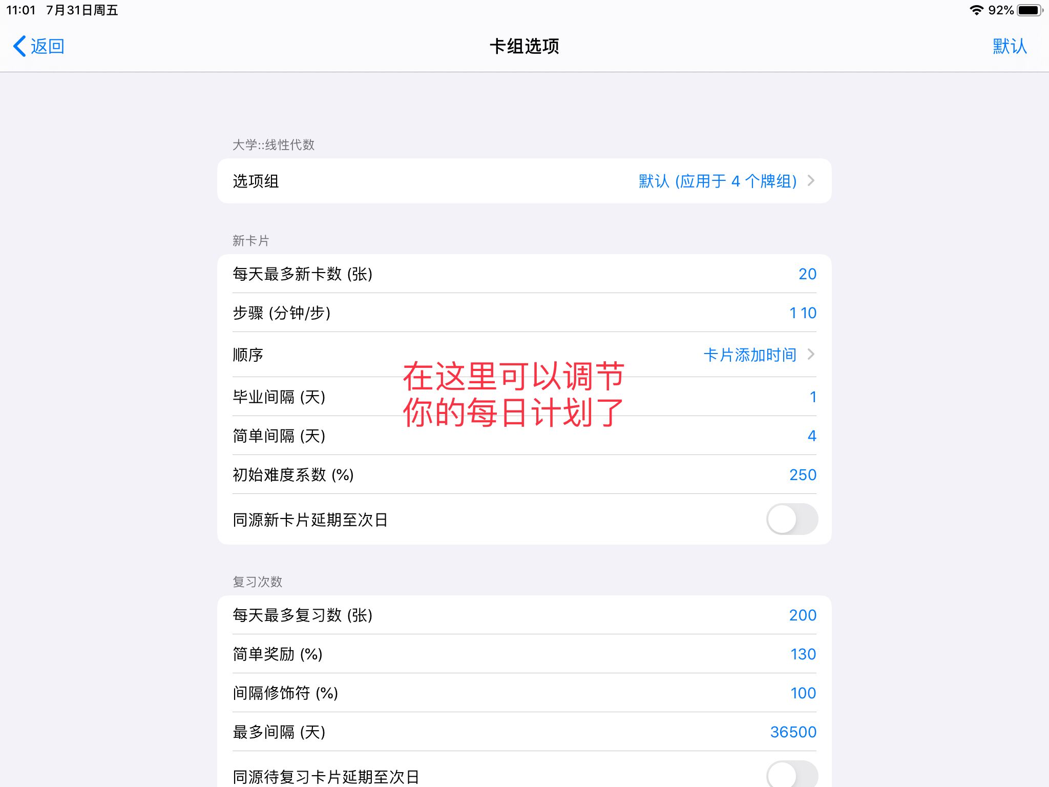 建议把最大复习数量调的尽可能高,让需要复习的「卡片」在当天解决。