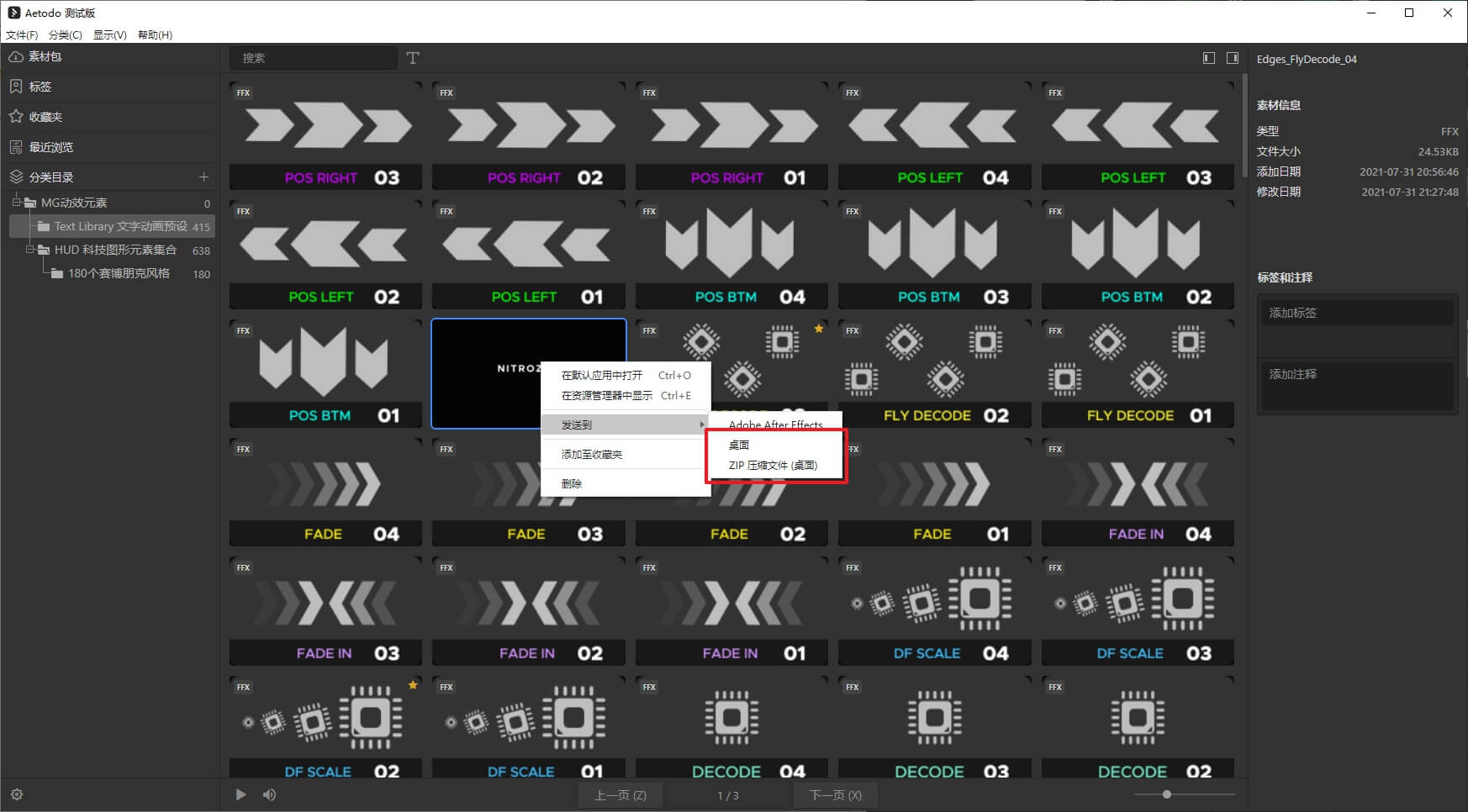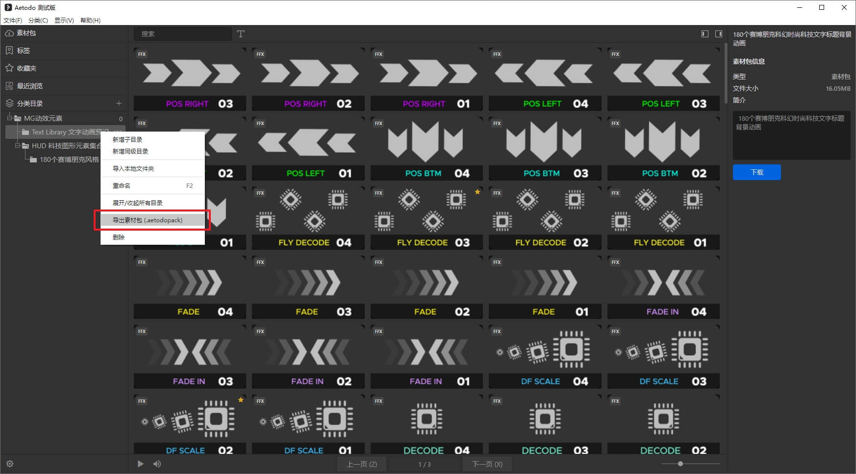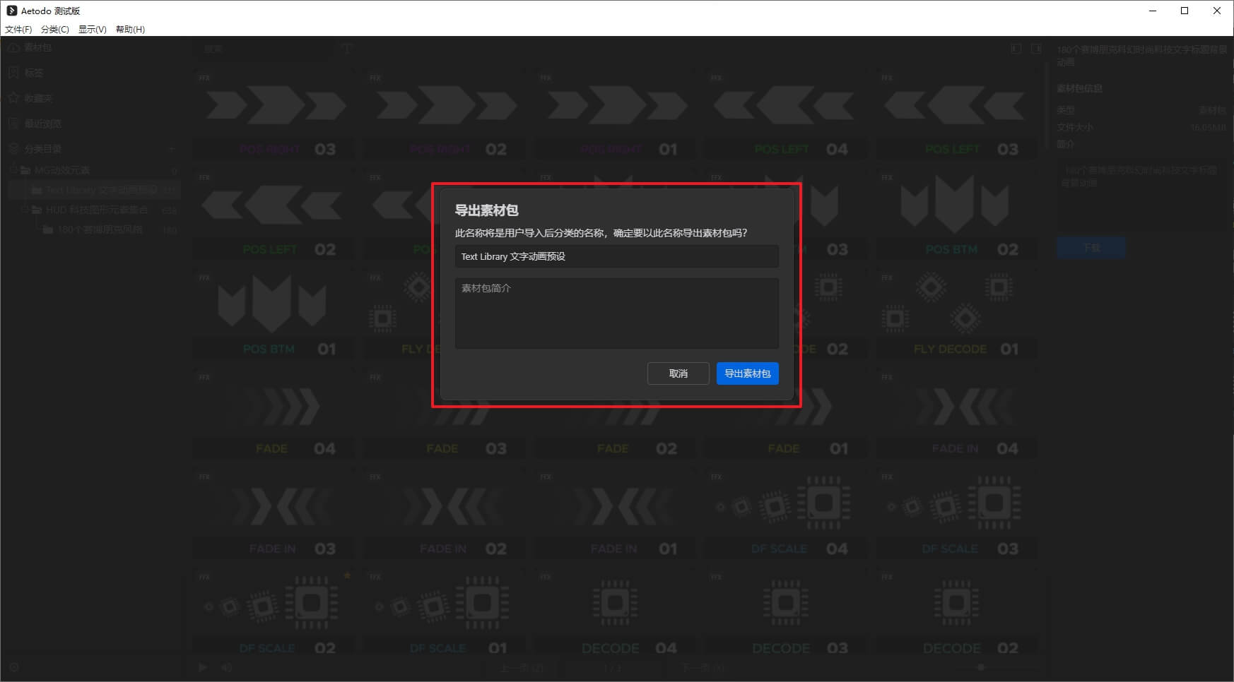 在选中的分类目录上右键,选择导出素材包,可以将当前分类全部素材导出为.aetodopack格式的素材包。(不是所有类型的文件都适合导出为素材包,比如视频文件就不适合导出为素材包,因为导出慢,安装也慢。而相对较小的单文件或者类似工程文件等比较适合导出为素材包)