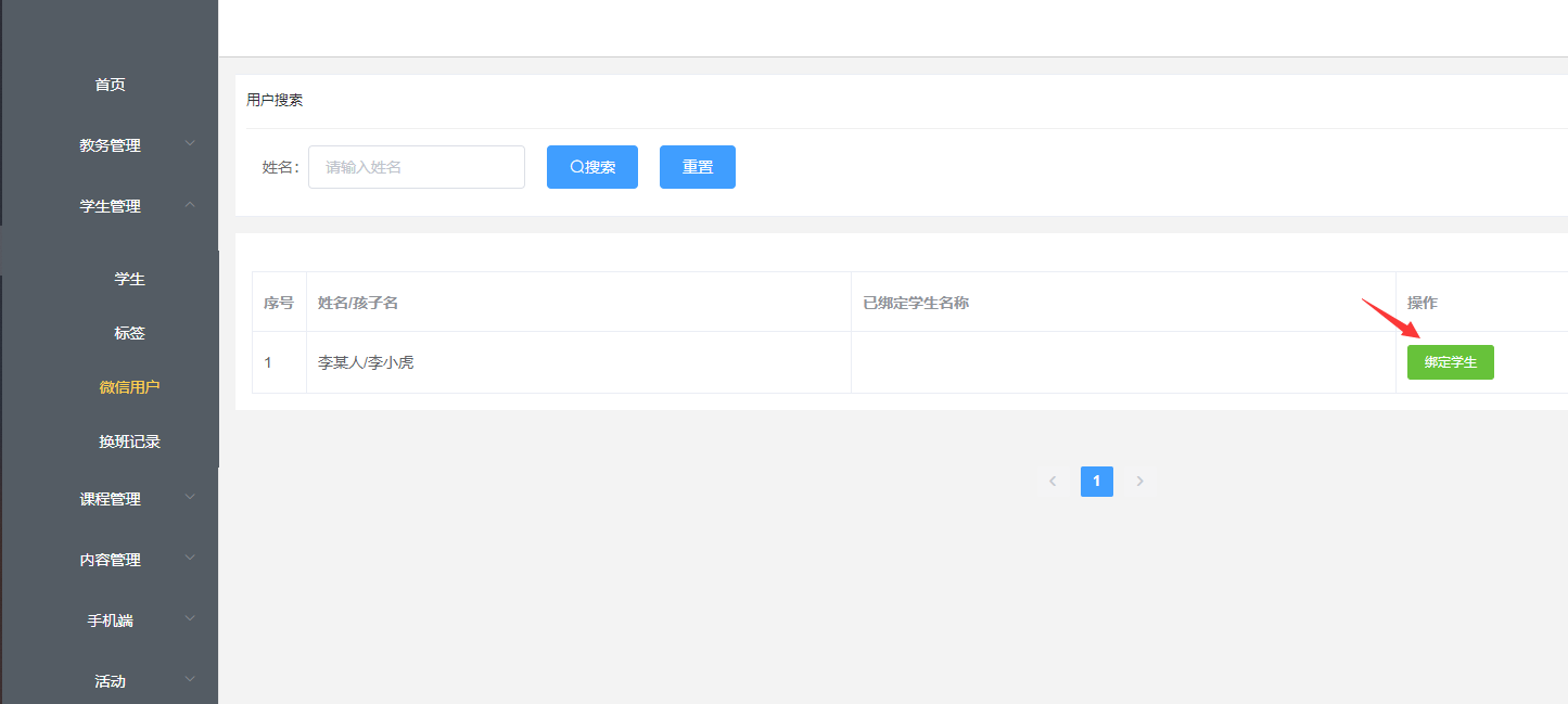 在后台管理系统中会显示用户所填写的信息和需要绑定的孩子信息,点击绑定按钮绑定学生