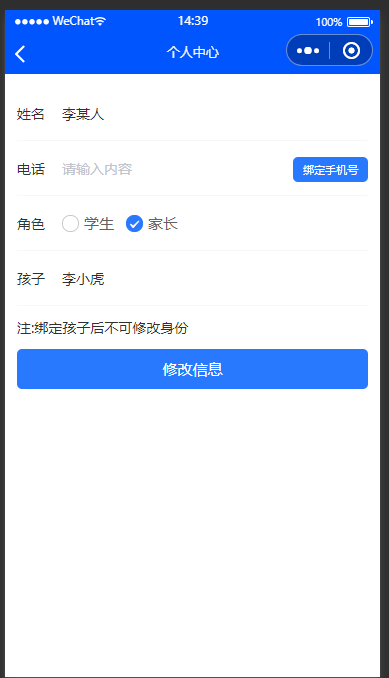 用户在我的页面中点击个人头像进入个人中心编写姓名和需要绑定的孩子姓名
