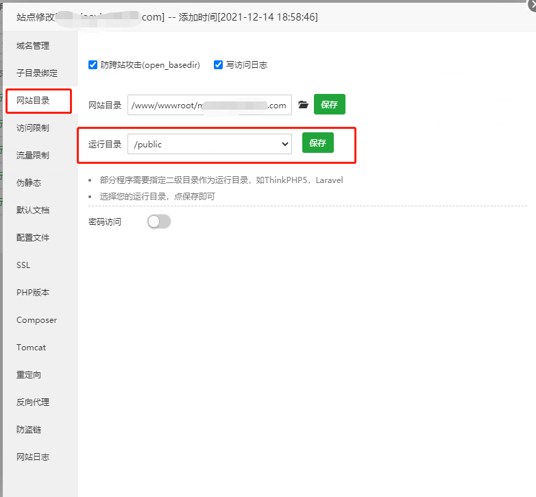 ## 修改站点配置,将网站目录中的运行目录修改为public并保存