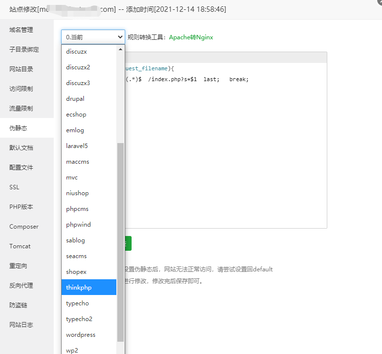 ## 伪静态选择thinkphp并保存