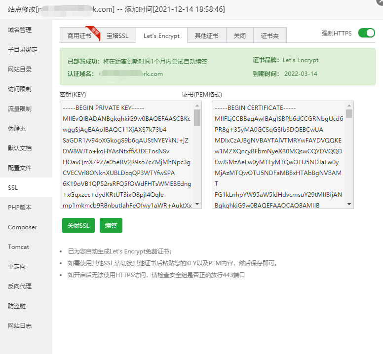 ## 配置SSL证书,使用宝塔自带的证书申请,或申请腾讯云/阿里云的SSL证书都可以