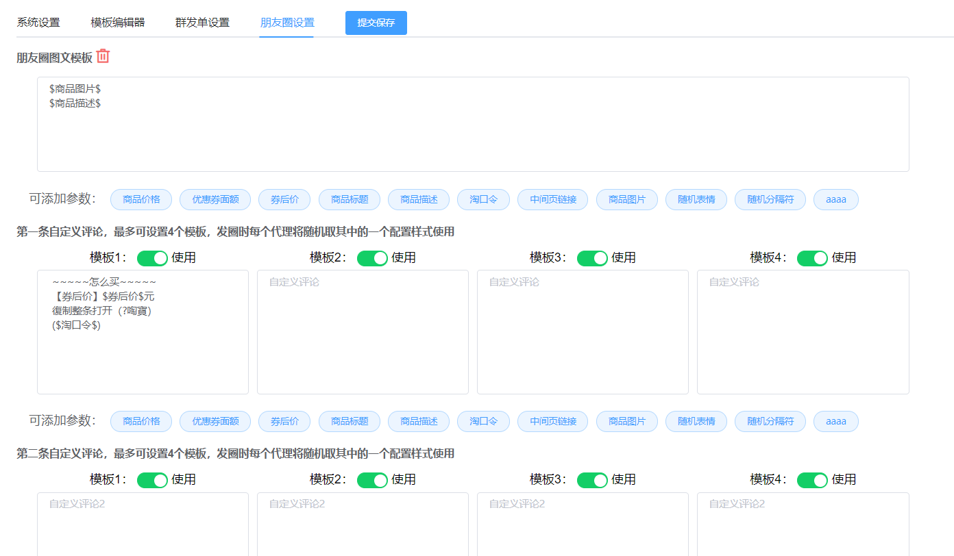 朋友圈有图文模板和评论设置,评论支持支持2条评论,每条评论支持4个模板