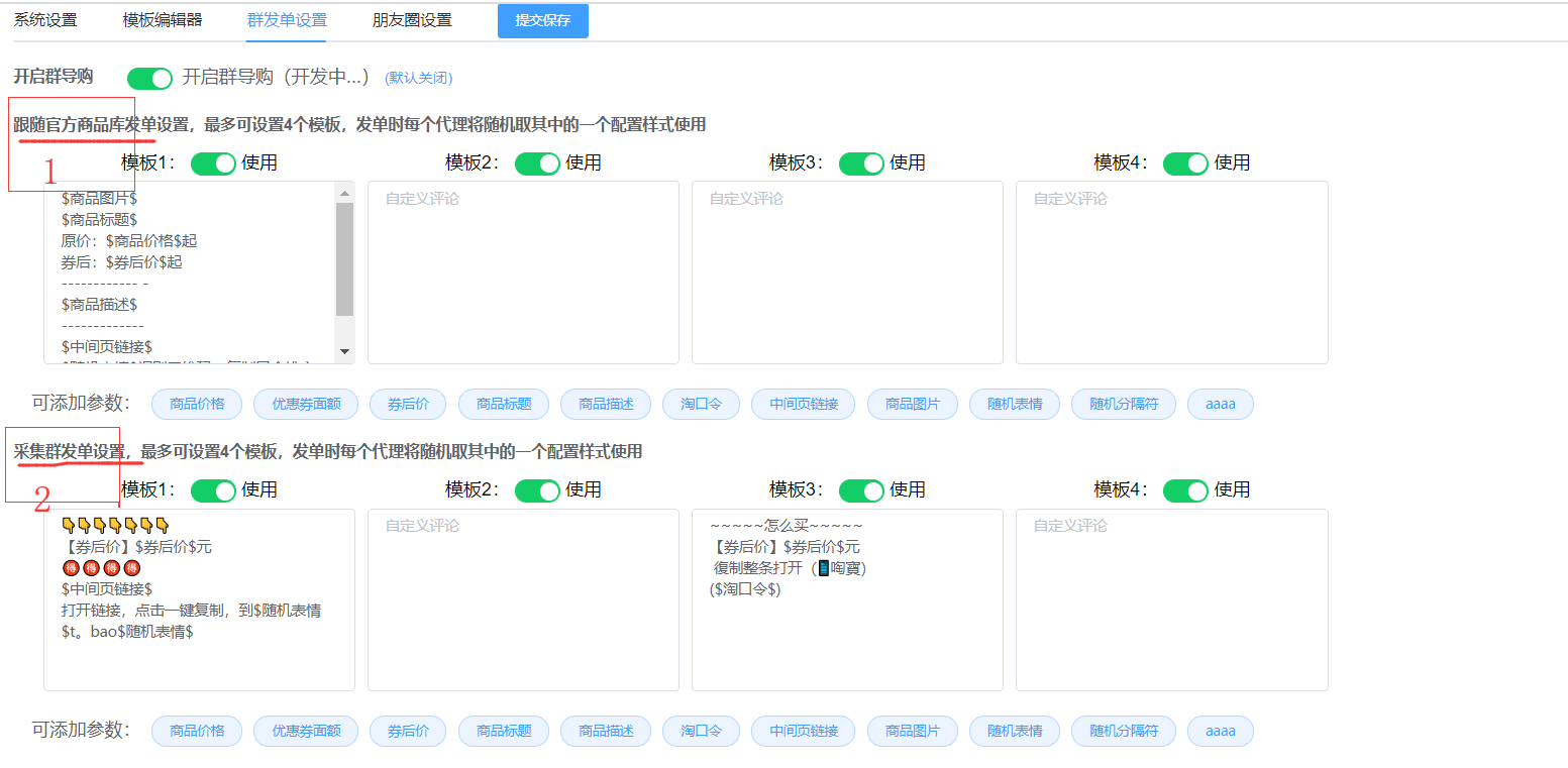 群发单模板支持两种:跟随官方商品库的模板和自定义采集的模板