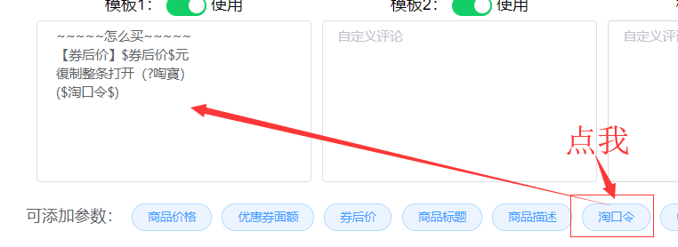 2、由于淘口令经常被微信封,所以为了灵活, 七星已经不指定口令的符号了。亲可以在淘口令参数前后加入你想要的符号,比如($淘口令$)