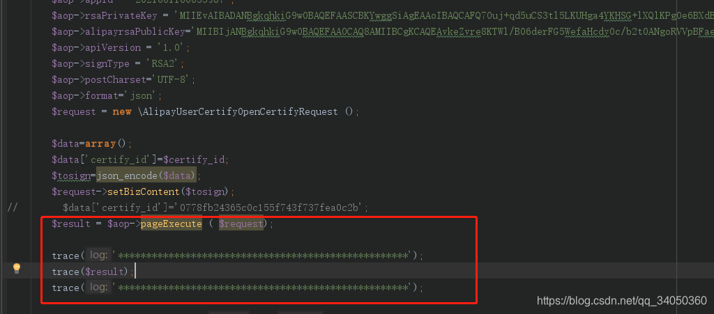$aop->rsaPrivateKey = '请填写开发者私钥去头去尾去回车,一行字符串';