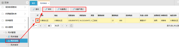 1、菜单:前台管理-网点管理-网点审核,找到对应需要审核的网点信息,点击“审核”按钮进入,查看注册信息无误后,点击“审核”即审核成功,或者点击“批量通过”“批量不通过”。