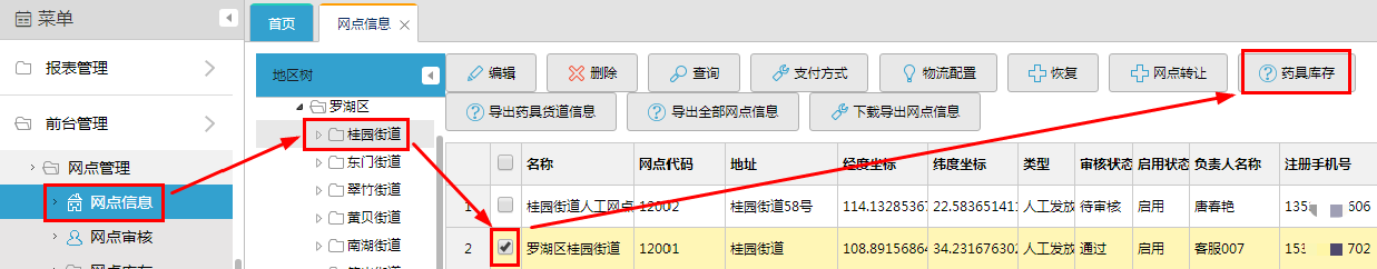 1、前台管理-网点管理-网点信息:选择网点,点击上方的按钮“药具库存”,进入网点药具页面;