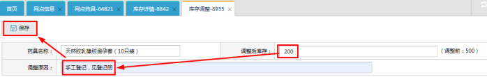 4、在库存调整页面,输入调整后库存数量和调整原因。 填写的调整后库存为修改后的库存数量,而非减少量,调整原因填写修改理由,或领取记录。填写完成后,点击“保存“按钮。提示:确定要调整库存吗,调整后无法恢复为原库存?确认填写信息无误,点击确定。