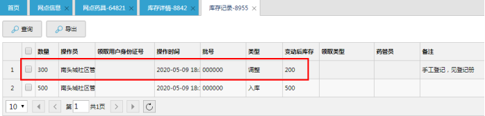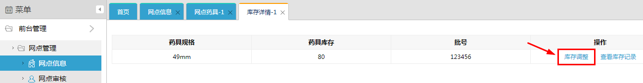 3、在库存详情页面,找到发放药具的批号,点击操作列的“库存调整”按钮;