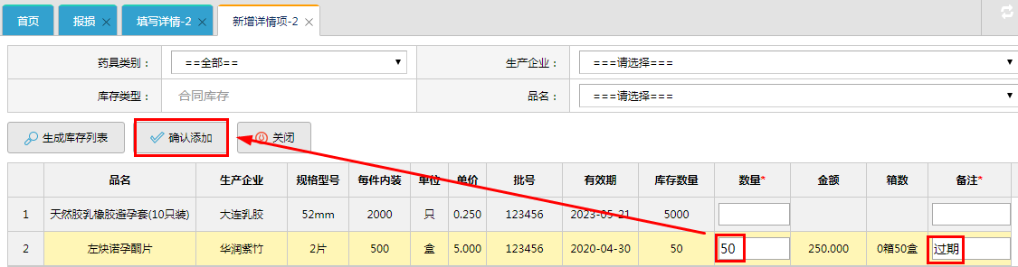 4.过期药具信息,输入数量和备注,点击确认添加按钮,如图: