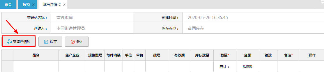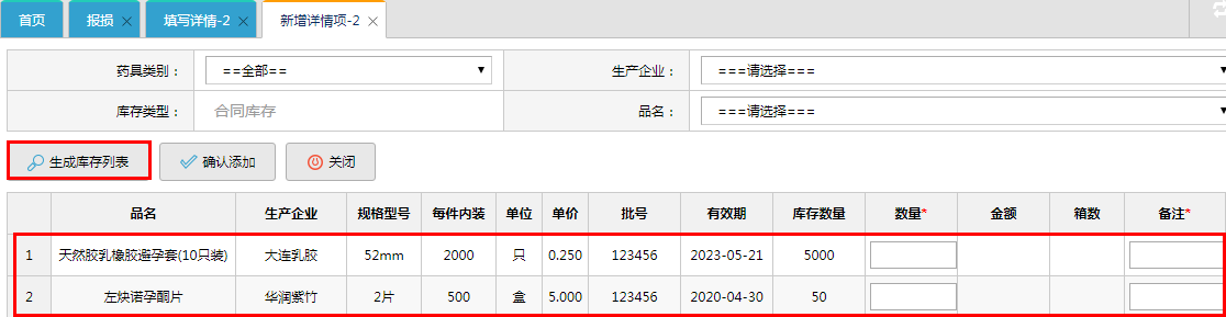 3.点击编辑详情进入,点击新增详情项按钮,点击生成库存列表,盘存所有药具会展示出来,如图: