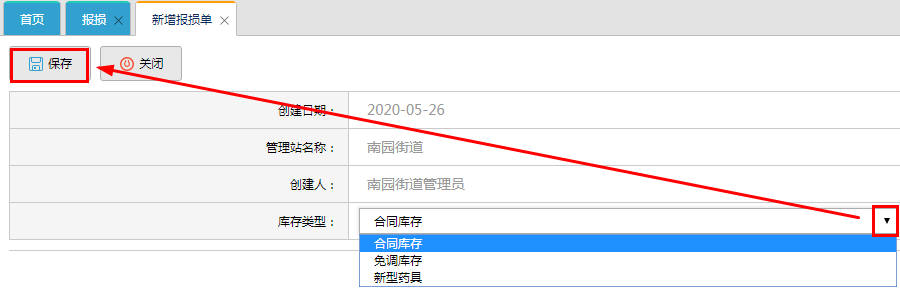 2.新增页面,库存类型选择,过期药具属于什么类型,就选择什么,选择后点击左上角保存按钮,如图: