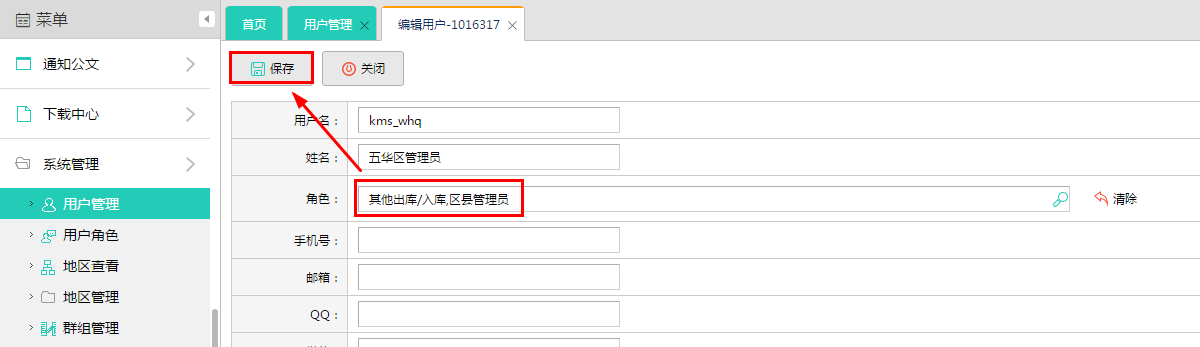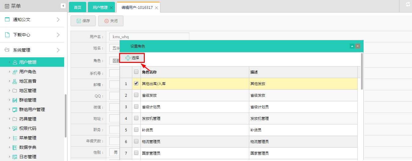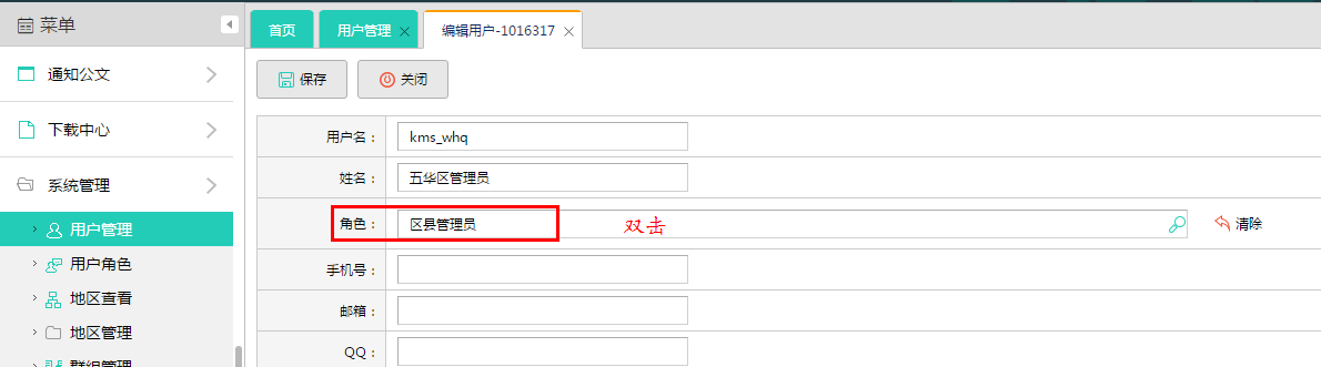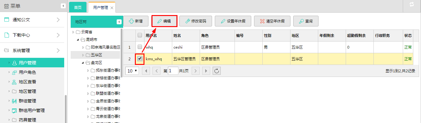 1、系统管理--用户管理--查找地区树,选择需要开放菜单的账号--勾选--点击编辑按钮进入,如图: