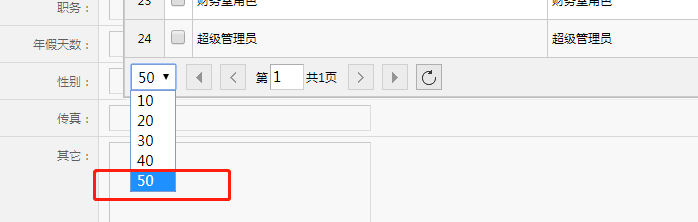 2、双击“角色”输入框,弹出设置角色的弹框,将左下角页面显示按钮选到50条/页显示,如图: