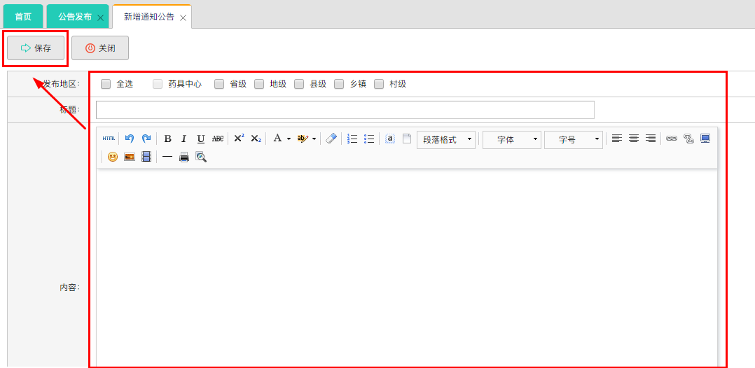 2、选择发布地区,输入公告标题,输入公告内容后,点击“保存”按钮。