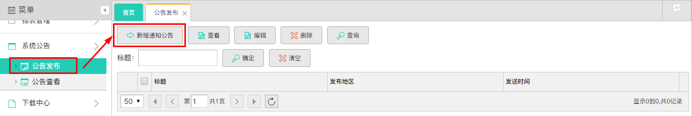 1、登录后台,进入菜单“系统公告-公告发布”,点击“新增通知公告”按钮。