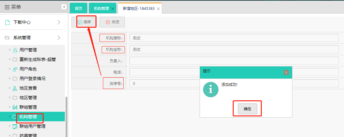 2、在新增页面,填写机构简称(必填)、机构全称(必填)、负责人(非必填)、电话(非必填)、排序号填0,最后点击“保存”按钮,弹框“添加成功”,点击“确认”按钮即可,机构就新增成功了。
