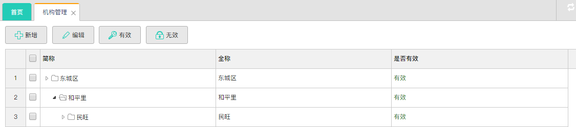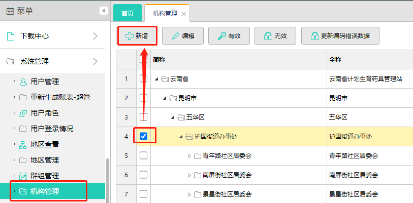 机构管理,是对药具单位进行管理的功能。可对机构进行新增、编辑、有效、无效。