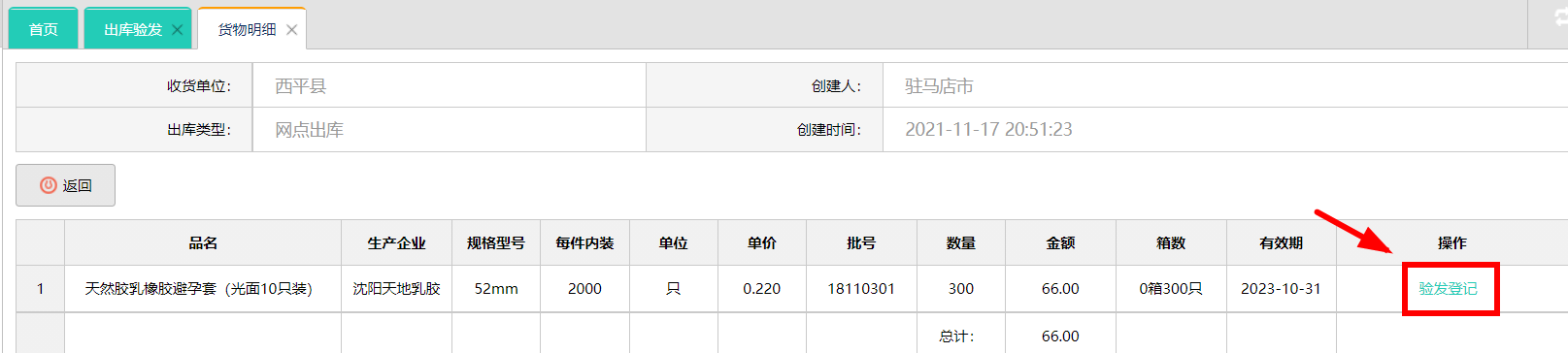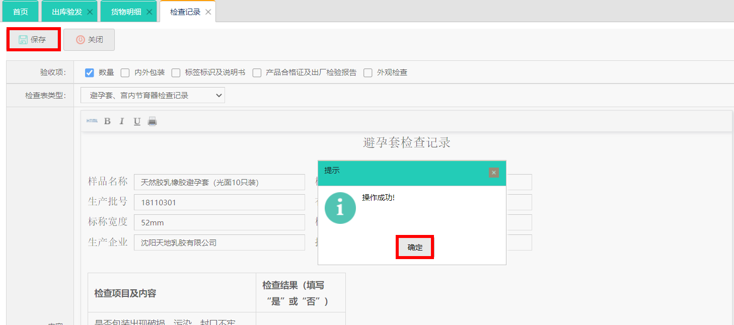 3、出库确认后,点击验发登记,进入检查记录页面,验收项根据实际情况确认勾选,下面的表格记录内容已默认填写,根据实际情况核对,无误后点击左上角保存按钮,提示操作成功,点击确定,如图: