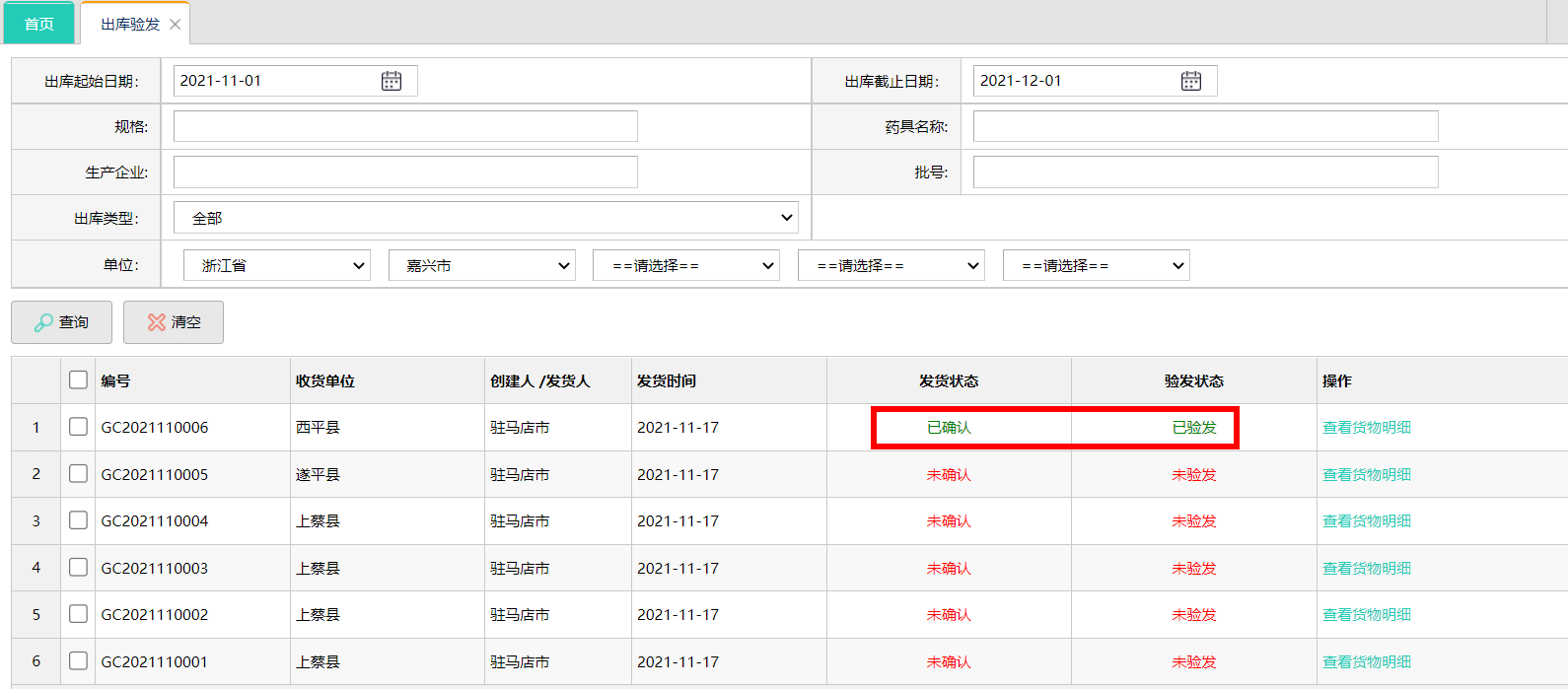4、验发登记完成后,返回出库验发菜单,发货状态和验发状态均已改变,至此出库质检完成。如图: