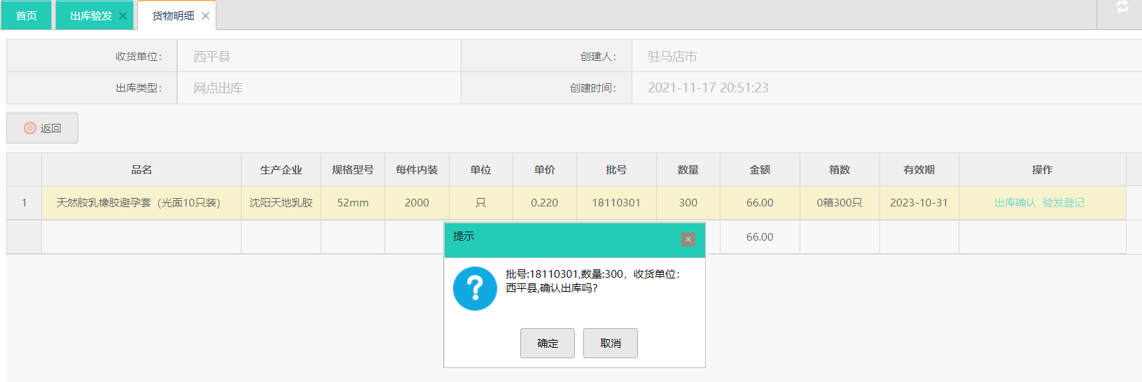 2、货物明细页面,点击出库确认,弹出提示语:批号:×××,数量:×××,收货单位:×××,确认出库吗?根据实际情况核对,点击确定,如图: