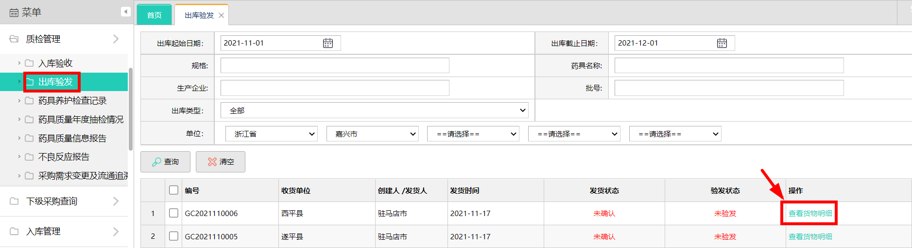 1、菜单:质检管理--出库验发,会显示需要出库质检的信息,发货状态和验发状态标红,点击查看货物明细,如图: