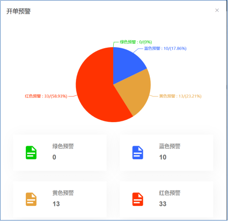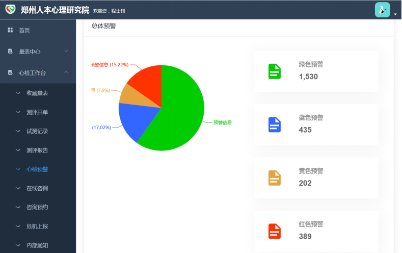 心检预警分为总体预警和开单预警,直观看到测评记录红、黄、蓝、绿四级预警的数量、所占比例和预警的详细信息。四级预警的判断依据是量表中各因子的预警值。需要注意的是,对于非身心健康类的测试量表,预警级别指该因子倾向性的明显程度,不表示症状的严重程度。