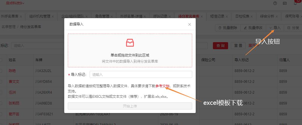 ### **进入待分发名单库,点击右中上角导入按钮。权限:组长以上可操作**