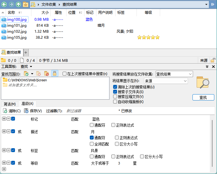 DOpus 的四项扩展属性,标记、描述、标签、评分,都可以通过查找窗格的高级模式进行搜索:
