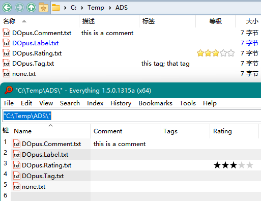 此外,Everything [v1.5.0.1276 以上](https://www.voidtools.com/forum/viewtopic.php?f=12&t=9787)也支持了搜索 DOpus 的描述、标签和评分 [^everything],不过目前没有中文语言,只能使用 v1.4 的语言包汉化一部分界面。若要开启支持,需要在安装后按照以下步骤设置:
