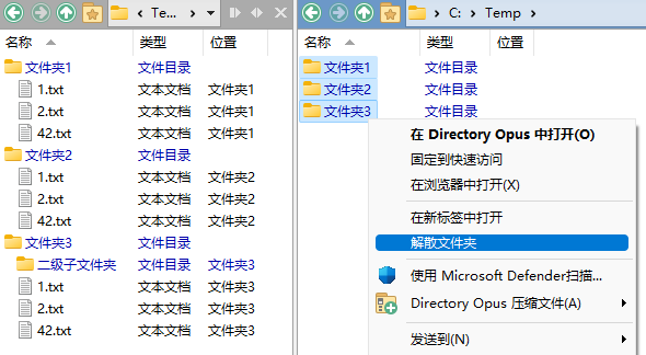 在 DOpus 中,可以通过以下命令来实现解散文件夹[^FlintyLemming]:
