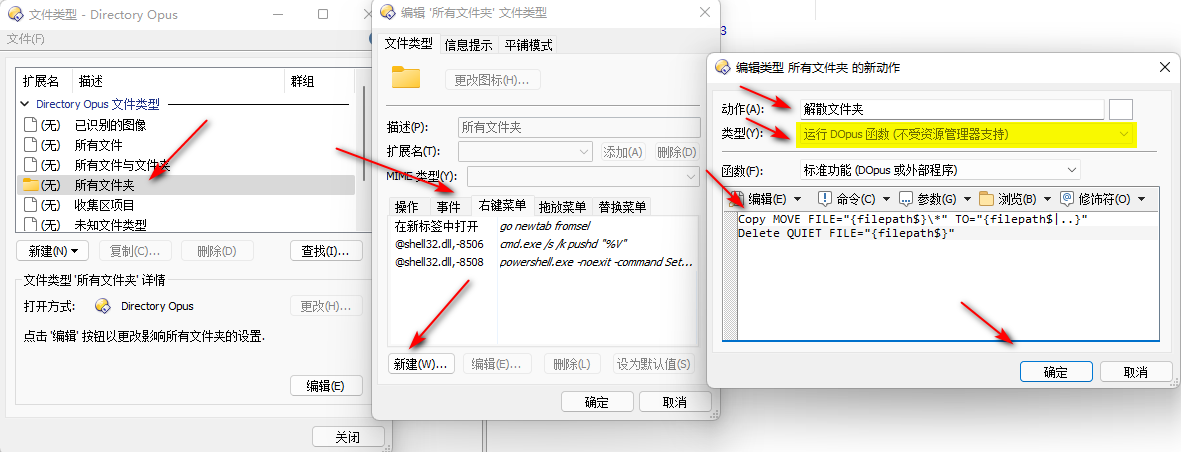 通过 `设置 > 文件类型` 打开文件类型编辑器,按下图操作,可以在文件夹的上下文菜单中添加一个“解散文件夹”按钮: