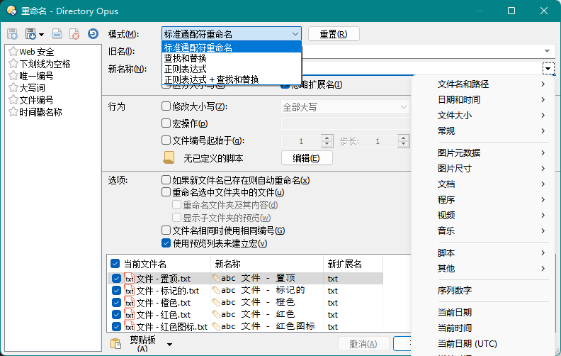 高级重命名可以实现复杂的批量重命名。支持通配符、宏(编辑录制)和正则表达式,能够插入序号和元数据字段,也可以使用 JS/VBS 脚本进行自定义处理。配置好的重命名规则可以保存为预设(上图左侧),便于之后再次使用。