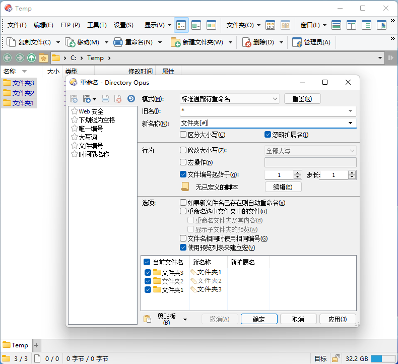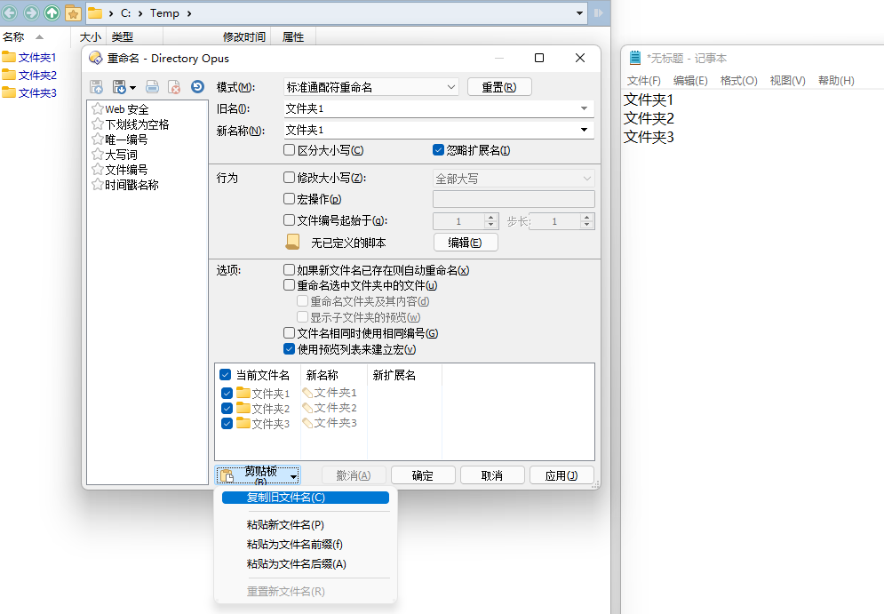 在批量重命名时,可能会出现某一文件的新名称与另一文件的旧名称冲突的情况,比如同时将 `文件夹1` 重命名为 `文件夹3`,将 `文件夹3` 重命名为 `文件夹1`。部分重命名工具无法正确处理这种情况[^冲突-小众],但 DOpus 和 Total Commander 都可以正确处理: