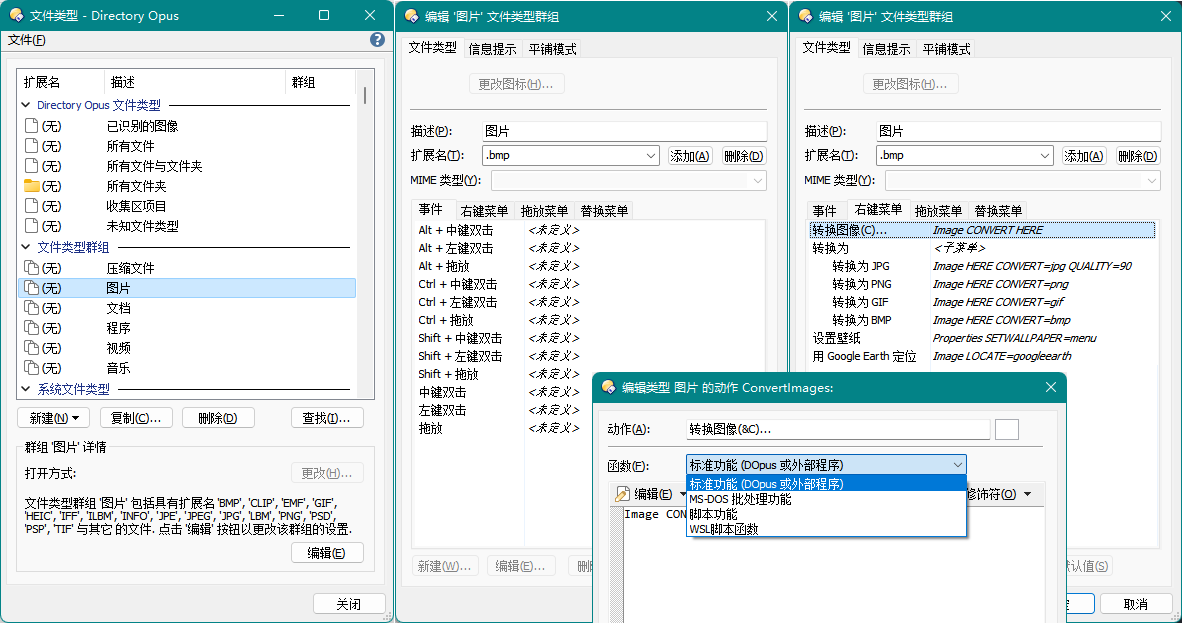 你可以为每个文件类型定义自己的鼠标动作、右键菜单和[信息提示](../浏览/查看/信息提示.md)。除了独立的文件类型外,DOpus 还有上图中的特殊文件类型和[文件类型群组](#文件类型群组),便于同时为一组文件类型定义动作。