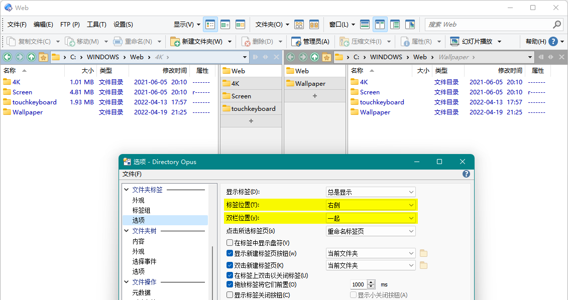 设置 `双栏位置` 为 `一起` 可以让双栏状态下的文件夹标签显示在一起,即左栏在右侧显示,右栏在左侧显示;`分开` 可以让文件夹标签对立显示,即左栏在左侧显示,右栏在右侧显示。